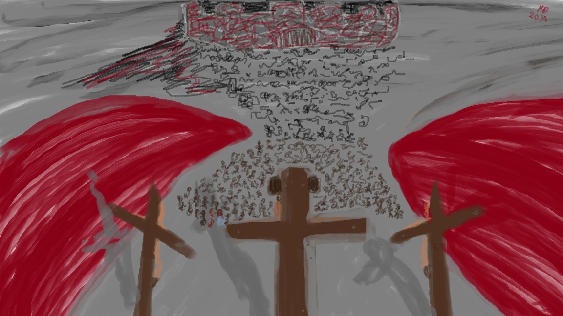 Note: I remember something my Dad mentioned once – imagine Barabbas listening to the cries of the people, first “Barabbas, Barabbas!”, then “Crucify him!” Yet, when the guards come to get him, Barabbas is led out into freedom. Barabbas is the only person whose place Jesus literally took in death.